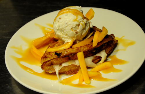 Nguyên liệu hoàn tất món bánh khoai mì nướng tổ ong chính kem dừa. Sự hòa quyện của miếng bánh khoai mì nóng hổi vừa giòn vừa dẻo với vị ngọt béo của sữa đặc, mùi thơm của mít chín, cái beo béo của dừa non và viên kem dừa mát lạnh đã khiến món ăn trở nên tròn vị. Món ăn được đầu bếp Michael Bảo Huỳnh phục vụ khách tại số 99 phố đi bộ giữa trung tâm Sài Gòn.