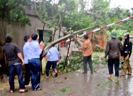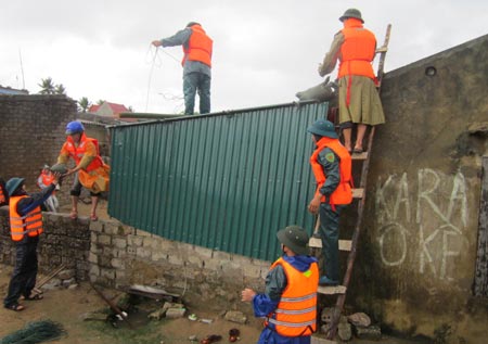 Quân dân huyện Quỳnh Lưu, Nghệ An chuẩn bị chống bão. Ảnh Hồ Hà. |