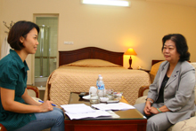 Nguyên Phó Chủ tịch nước Trương Mỹ Hoa trong một lần đến thăm trung tâm dạy nghề cho người khuyết tật, trẻ mồ côi tại TP.HCM. |