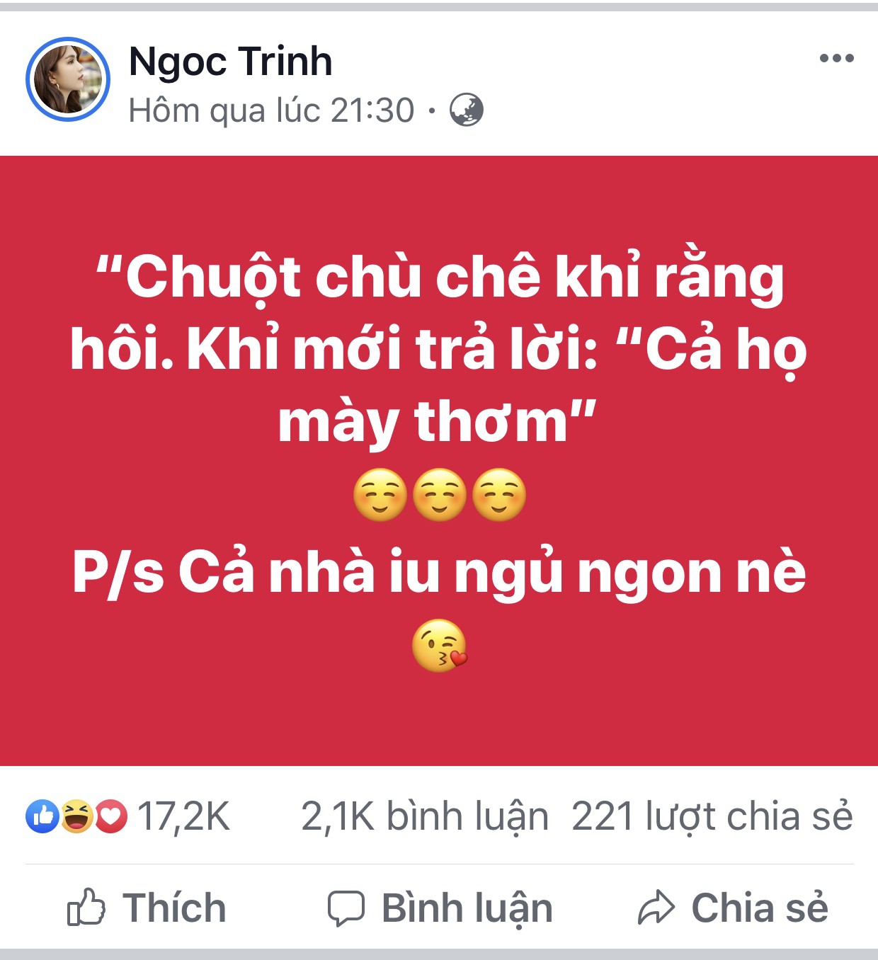 Những tưởng mọi việc dừng lại ở đây thì trên trang cá nhân, chia sẻ mới nhất của Ngọc Trinh vẫn tiếp tục nhắm vào những người đã lên tiếng về sự xuất hiện của cô ở Cannes. Khác với các chia sẻ của “người nhà”, Ngọc Trinh cố tỏ ra sâu cay khi trích dẫn câu tục ngữ: Chuột chù chê khỉ rằng hôi/Khỉ mới trả lời cả họ mày thơm”.