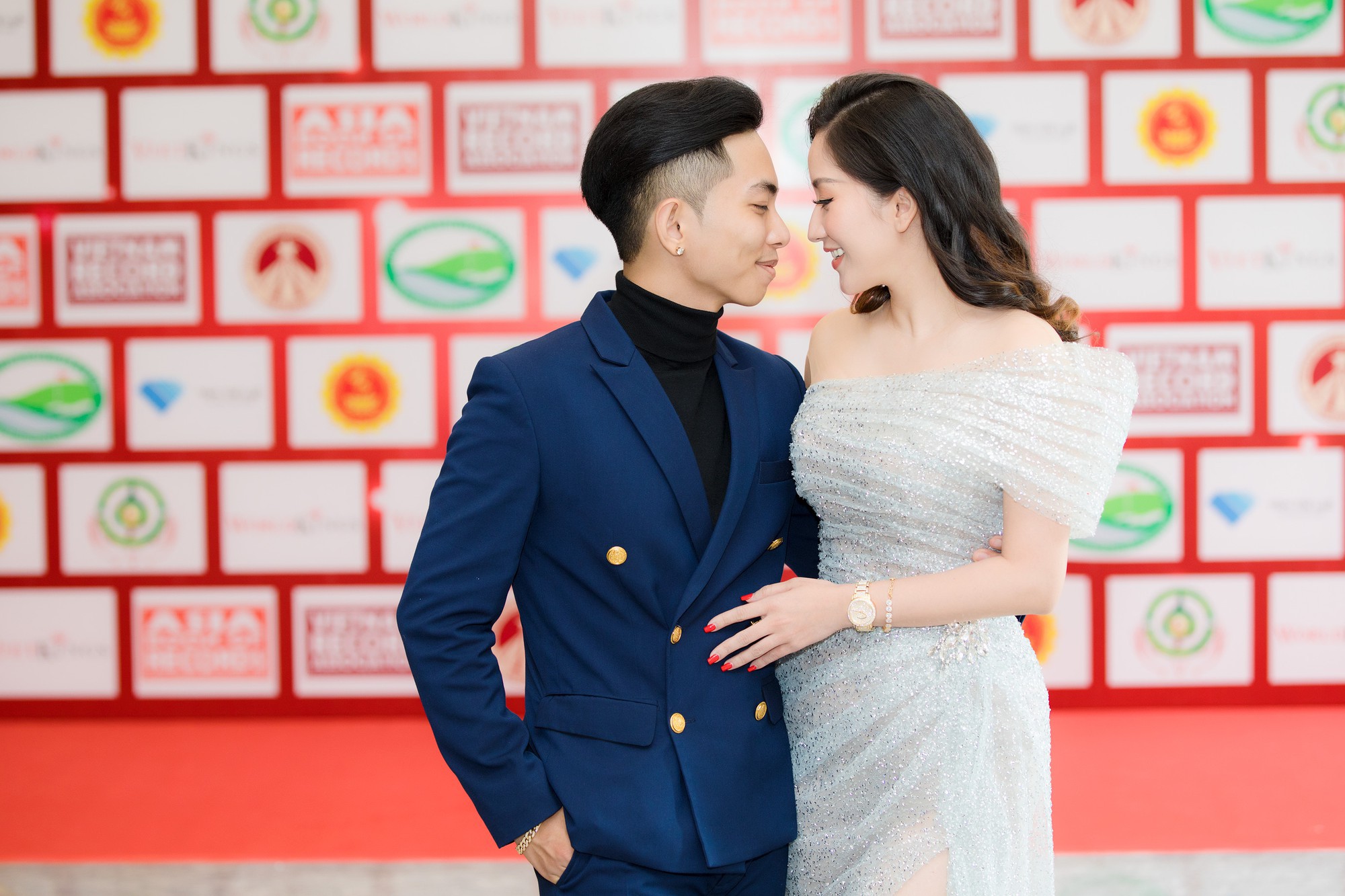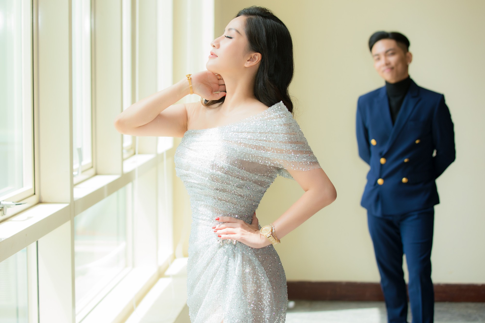 Khánh Thi chỉ cần xinh đẹp thôi, việc chỉnh váy đã có con trai lo