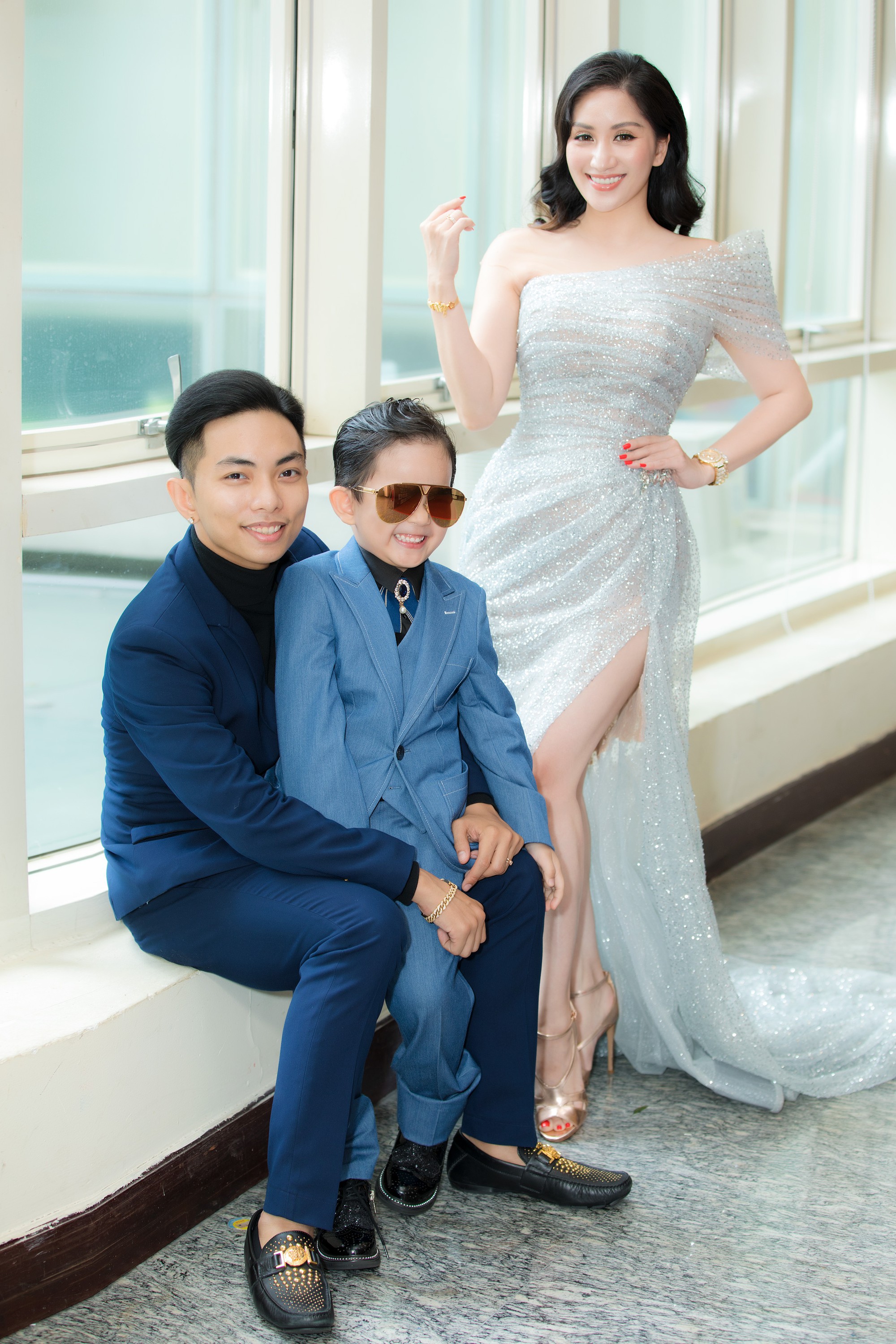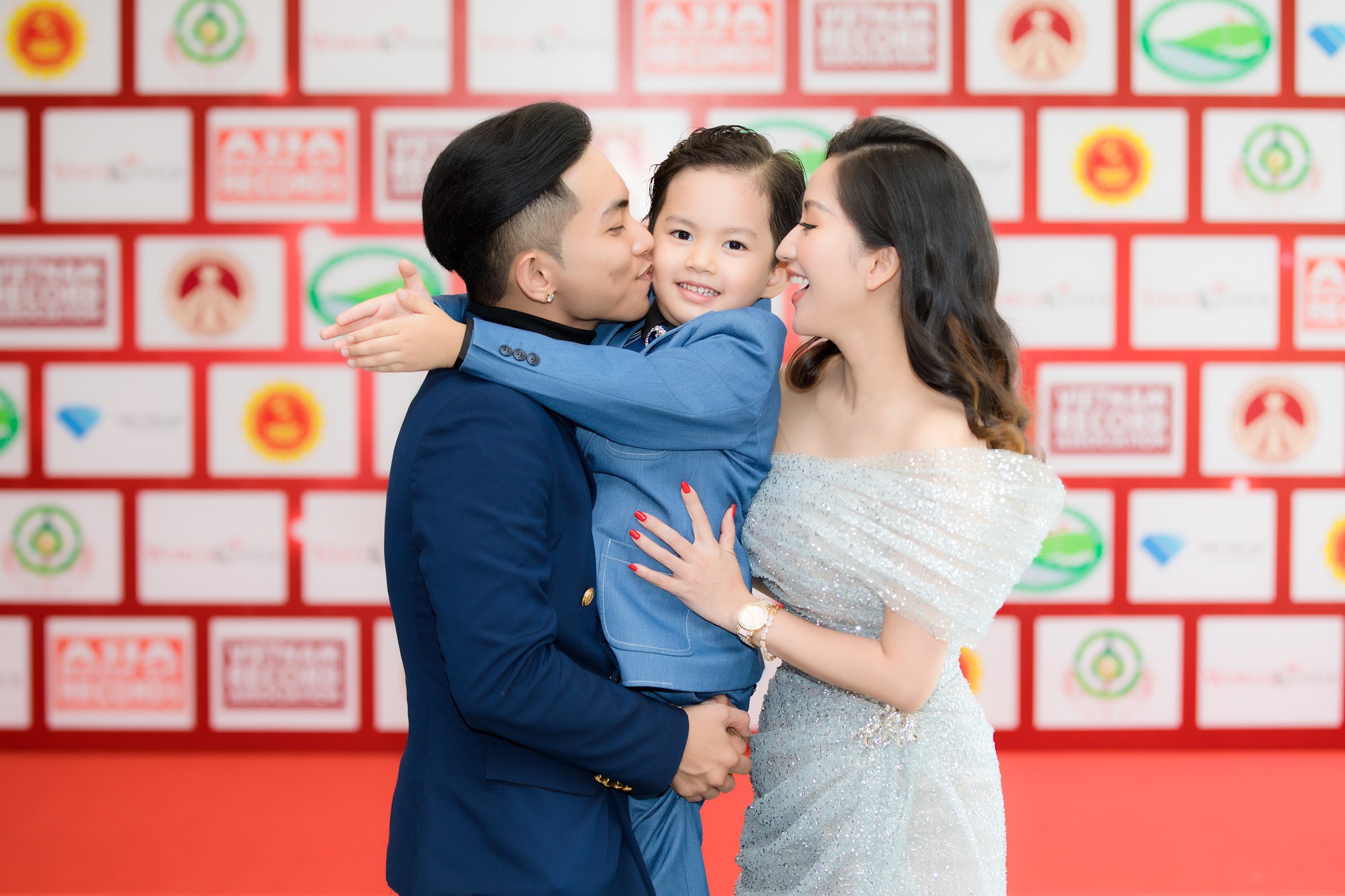 Ông xã kém tuổi Phan Hiền và cậu con trai cũng tháp tùng mẹ Khánh Thi tham dự sự kiện. 2 cha con diện vest tông xanh tím than khá ăn ý với nhau trong khi Khánh Thi chọn đầm lệch vai xẻ cao tới đùi, khoe trọn vẻ sexy của "gái hai con".