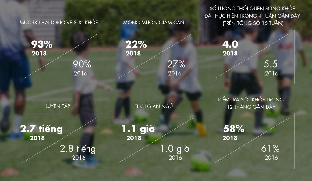 Kết quả này phản ánh sự kỳ vọng thay đổi của người Việt Nam về lối sống và cách cư xử lành mạnh lý tưởng cũng như thay đổi những thói quen sống hàng ngày. Mặc dù mức độ hài lòng với tình trạng sức khoẻ tăng lên nhưng tỷ lệ người Việt Nam sẵn sàng áp dụng và duy trì những thói quen sống khoẻ lại giảm đi. Trung bình, người Việt Nam tham gia khảo sát dành 2,7 giờ để tập thể dục trong 1 tuần – giảm so với mức 2,8 giờ trong năm 2016.