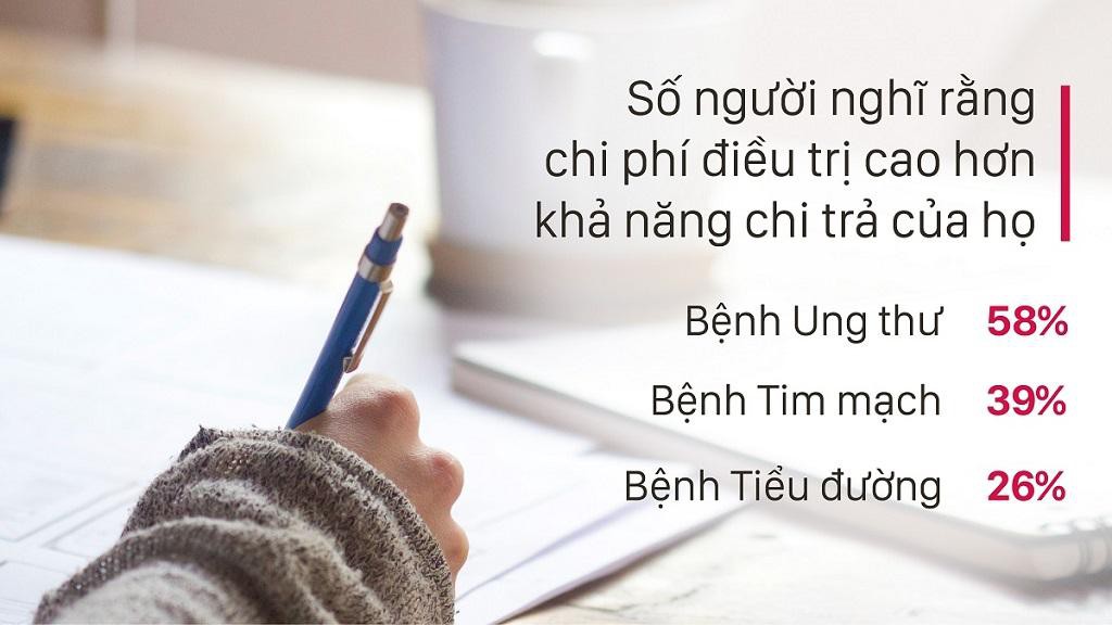 Tại Việt Nam, 57% người tham gia khảo sát có chung mối quan ngại về chi phí ước tính để điều trị các bệnh hiểm nghèo. Khi được yêu cầu ước tính về chi phí điều trị bệnh ung thư mà họ có thể chi trả, hơn một nửa (58%) số người tham gia khảo sát ước tính một khoản tiền sẽ khiến họ lâm vào hoàn cảnh tài chính khó khăn.