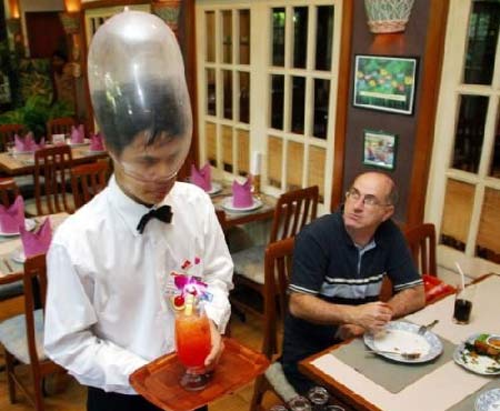 Vừa đặt chân tới cửa nhà hàng, bạn sẽ được chào đón bằng chiếc bao cao su (BCS) khổng lồ, sau đó mới đến nụ cười duyên dáng của các cô gái Thái Lan. Liên tiếp trên các lối đi dẫn tới các khuôn viên của nhà hàng ta đều bắt gặp rất nhiều khẩu hiệu, hình ảnh minh họa cho việc sử dụng BCS trong “chuyện ấy” theo những cách rất hài hước nhé.
