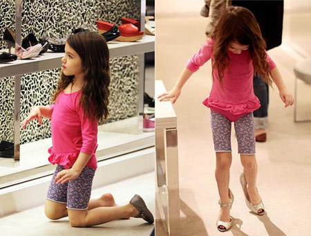 ![]() Suri vừa giúp mẹ chọn giày vừa tự thử giày trong khi đi mua sắm tại Vancouter. |