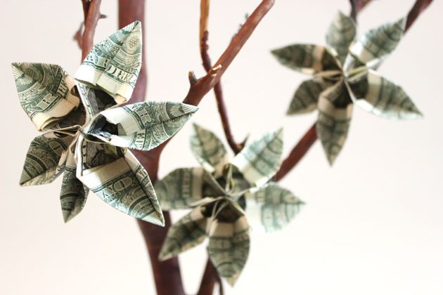 Bước đầu tiên cần thực hiện là làm hoa tiền. Bạn trải phẳng tờ tiền giấy rồi gấp các cạnh trái và phải vào trong một đoạn khoảng 3.8cm.