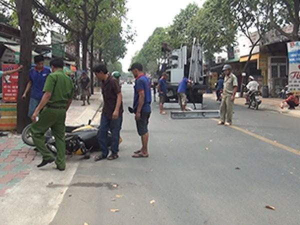 Lúc này, chị Trịnh Thị Hồng (20 tuổi, ngụ tỉnh Bắc Giang) điều khiển xe máy mang BKS: 59N2-484.28 chạy hướng ngược lại bị rơi trúng. Chị Hồng cùng phương tiện bị ngã ngang xuống đường, bị thương. Người dân đưa nạn nhân đi cấp cứu sau đó.