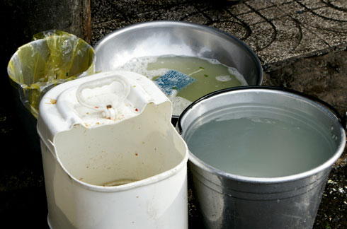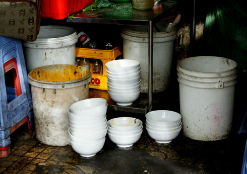 ![]() Chậu nước đục ngầu phía ngoài để tráng sau khi rửa xà bông, xô bên phải là nước rửa tô lần cuối trước khi múc thức ăn cho khách. Thùng chứa nước rửa bày luôn cạnh nơi khách ngồi ăn. |