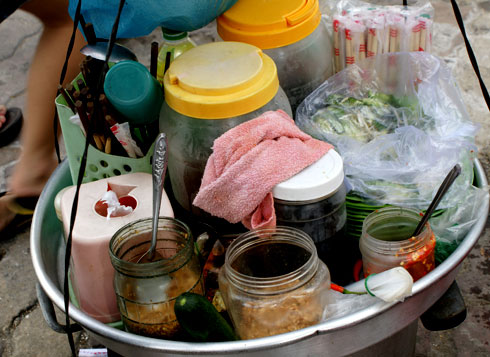 ![]() Giải pháp tối ưu để làm sạch tô đĩa trong điều kiện thiếu nước rửa của gánh hàng rong là chiếc khăn. Người bán cùng chiếc khăn này lau tay, lau dao, lau thớt và lau cả vật chứa thức ăn. Chỉ cần xoay một vòng, đĩa đang nhơn nhớt dầu cũng trở nên dễ nhìn. Một số người buôn bán kỹ tính hơn thì luôn chuẩn bị sẵn một can nước to loại 30 lít để thường xuyên thay nước rửa. Ông Huỳnh Lê Thái Hòa, Chi cục trưởng An toàn vệ sinh thực phẩm TP HCM, cho biết trách nhiệm quản lý hàng rong do các quận huyện đảm trách song rất khó quản lý cách người bán rửa tô chén ở vỉa hè. Vệ sinh thực phẩm sạch hay bẩn đều phụ thuộc ý thức tự giác của người bán hàng. |
