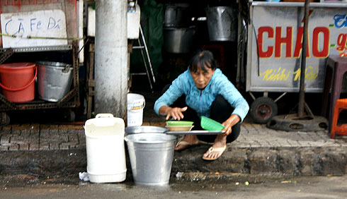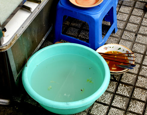 Hầu hết quán hàng rong trên vỉa hè Sài Gòn chỉ dùng một thau nước rửa bát đĩa duy nhất cho cả ngày buôn bán.