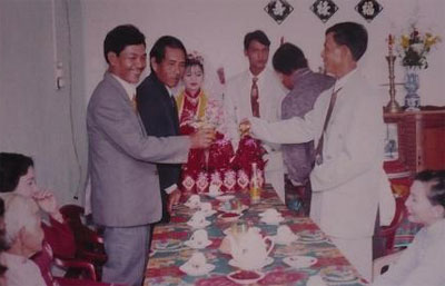 Gia đình bà Nguyễn Thị Bích Hạnh (người mặc áo dài đỏ) tiếp nhận lễ vật cầu hôn từ gia đình Phạm Mạnh Kỳ gần 10 năm trước... |