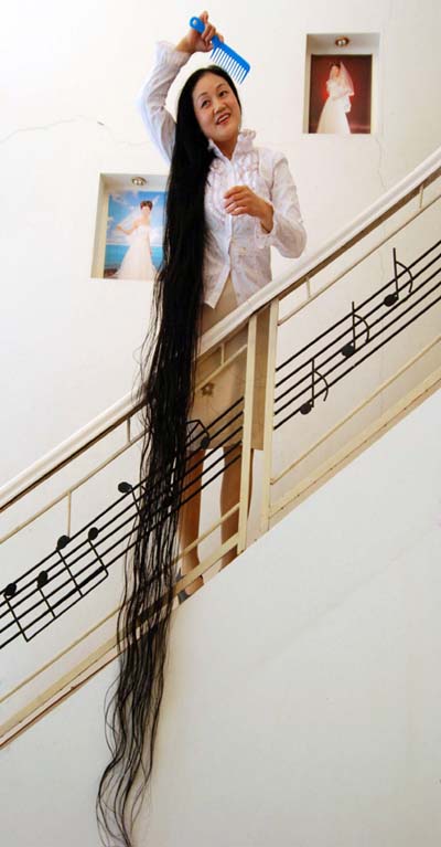 Ông Bhai Sarwan Singh (trái) và mái tóc của côXie Qiuping. |