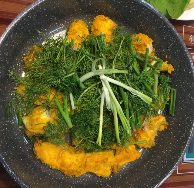 Cá nướng xong xếp ra chảo, cho thêm mỡ cá vào chảo. Phủ hành lá, hành hoa rau thìa là lên trên, đặt chảo lên bếp từ, vừa đảo vừa ăn kèm với bún, mắm tôm, lạc.