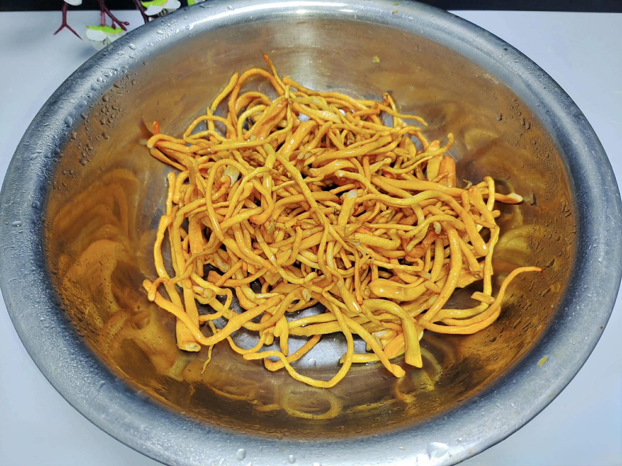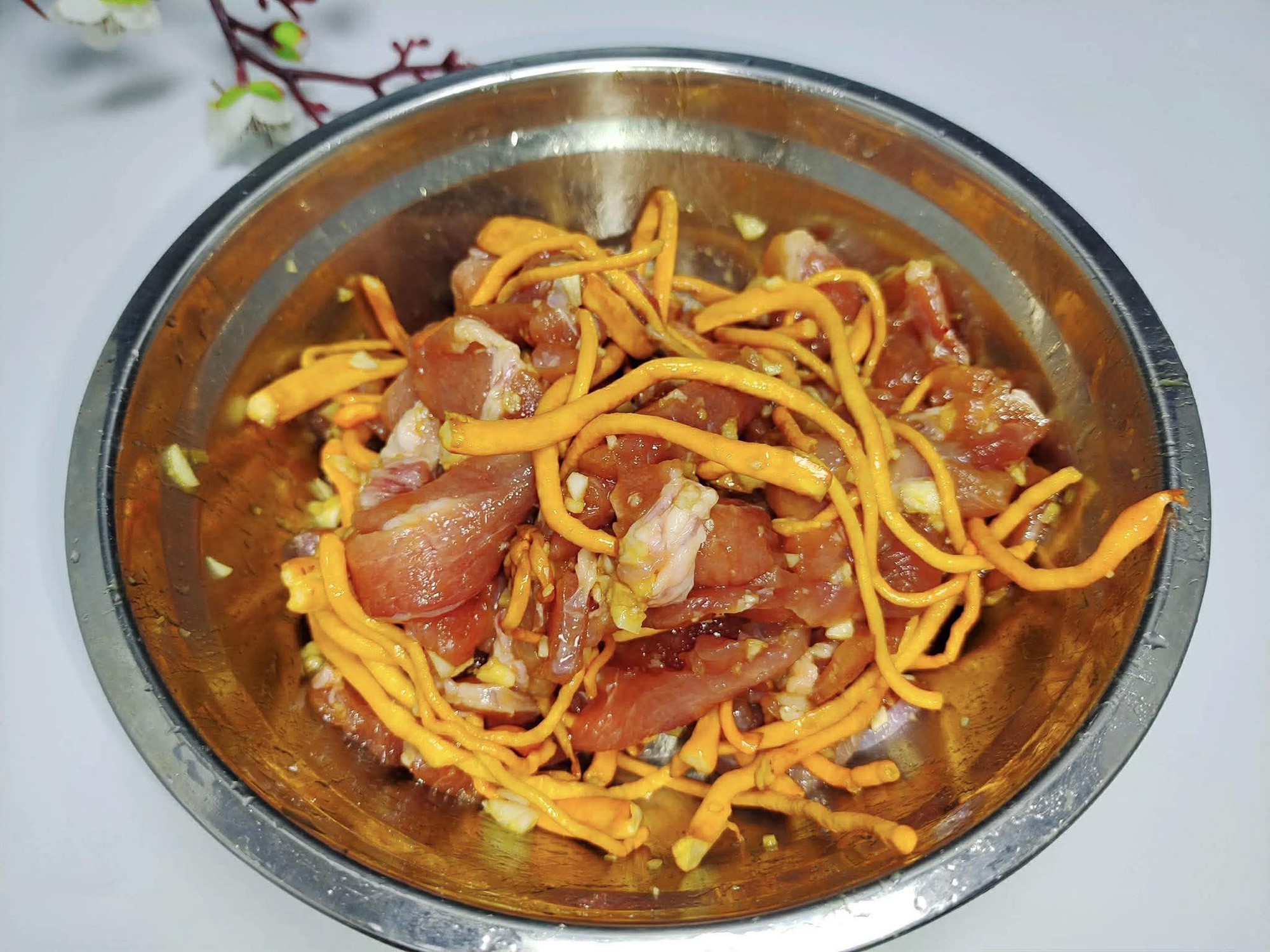 Bước 2: Chuẩn bị một nắm hoa đông trùng hạ thảo tươi, rửa sạch với nước sạch và để ráo. Nếu không tìm được hoa đông trùng hạ thảo tươi, bạn có thể dùng loại khô; chỉ cần ngâm chúng trong nước lạnh trước để chúng ngấm nước hoàn toàn, nở đều ra là được. Rửa sạch thịt nạc vai, thái lát mỏng và cho vào bát. Thêm một ít tỏi băm, nước tương, dầu hào, gia vị và dầu ăn cùng một chút bột bắp vào rồi trộn đều. Ướp thịt trong khoảng 15 phút. Sau đó, cho nấm đông trùng hạ thảo đã rửa sạch vào bát thịt, trộn đều và để sang một bên.