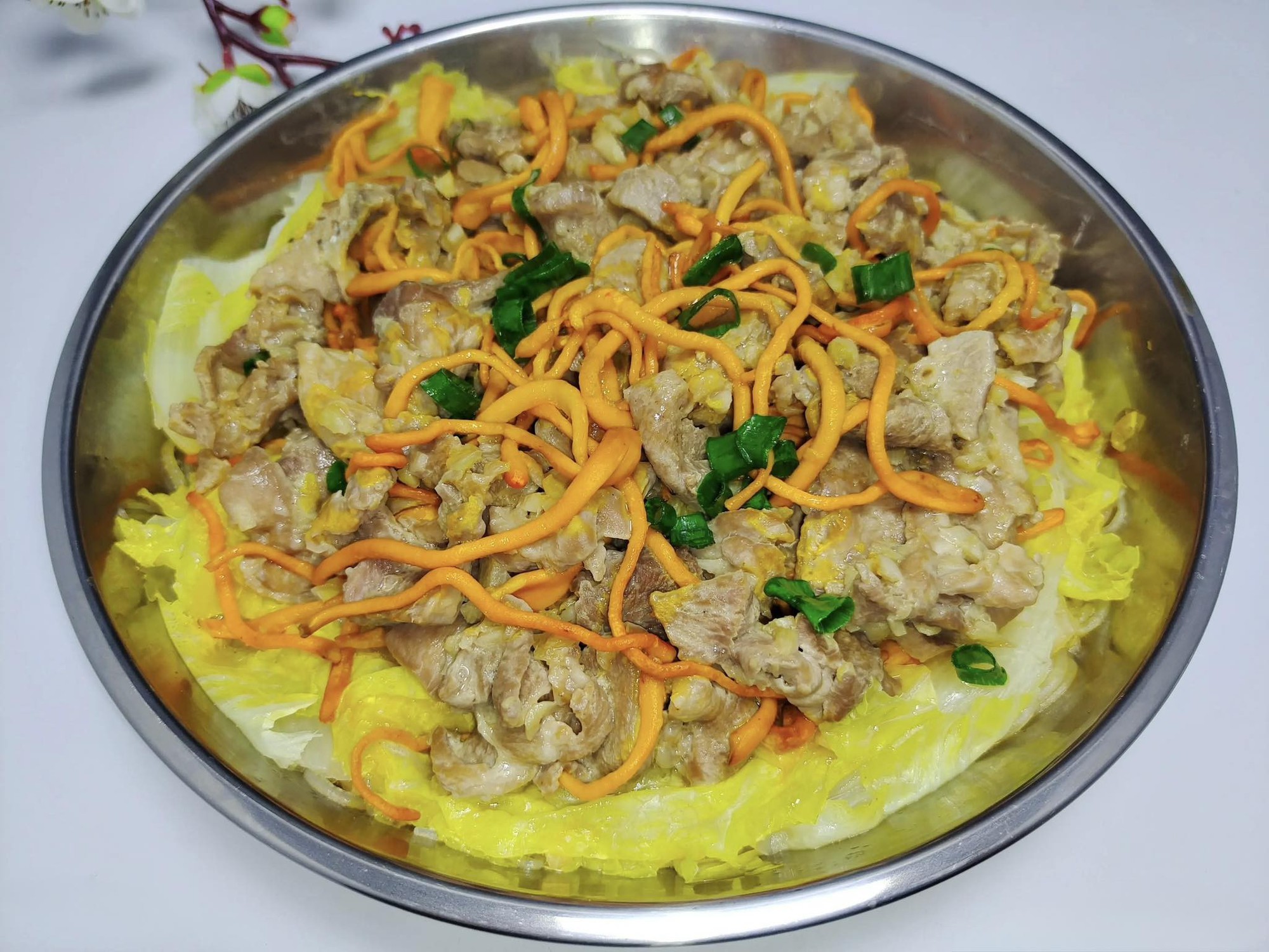 Bước 3: Lấy đĩa đựng cải thảo và miến ra, sau đó rải đều các lát thịt đã ướp cùng nấm đông trùng hạ thảo lên trên. Như vậy là thao tác sơ chế đã hoàn thành và bạn có thể sẵn sàng hấp món ăn. Cho nước vào nồi hấp và đun sôi trên lửa lớn. Sau khi nước sôi bạn đặt đĩa nguyên liệu lên xửng, đậy nắp và hấp trên lửa lớn khoảng 10 phút. Khi hết thời gian, tắt bếp rồi rắc hành lá thái nhỏ lên trên và rưới một chút nước tương hoặc nước tương cá hấp vào trước khi dùng.