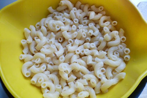 - Cho khoảng 1 lít nước lã vào nồi đun sôi cùng với một thìa nhỏ muối rồi cho nui vào luộc sơ (không luộc chín hẳn), sau đó cho nui ra rổ cho ráo nước.