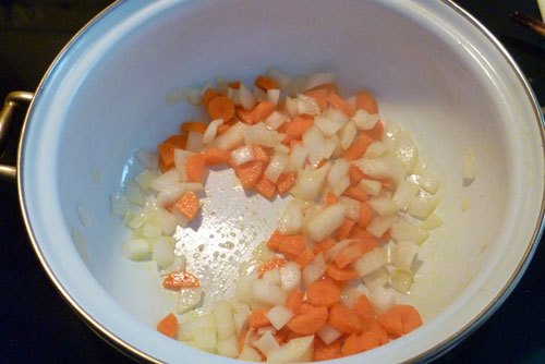 - Bắc nồi nấu súp lên bếp để lửa vừa, cho vào nồi khoảng một thìa canh dầu ô liu, tiếp theo cho hành tây và cà rốt vào xào, nêm vào chút muối cho đậm đà.