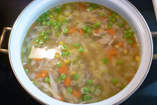 Cho nước luộc gà vào, đun sôi rồi cho ngô, đậu, nui và thịt gà xé vào. |