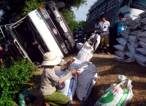Rạng sáng 12/8, ôtô chở 20 tấn thức ăn hỗn hợp bị lật nghiêng xuống bờ ruộng trên quốc lộ 19, đoạn đi qua thị trấn Tuy Phước, Bình Định. Người dân đã nhào ra khiêng các bao thức ăn về.