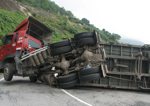 Xe đầu kéo kéo theo rơ moóc đã bị lật nhào tại dốc cua Tay Áo trên đèo Hải Vân (Thừa Thiên - Huế), gây ách tắc giao thông 11 giờ.
