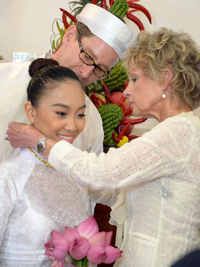 Lễ rước dâu của Đoan Trang diễn ra lúc 10h sáng ngày 29/7 tại nhà của Đoan Trang ở Long Khánh, Đồng Nai. Mẹ chồng của Đoan Trang đeo nữ trang cho con dâu. |