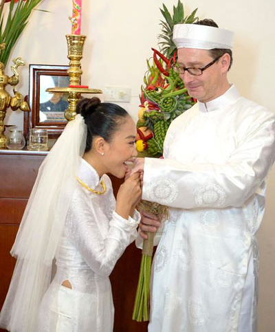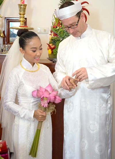 Chú rể xuất hiện với chiếc áo dài và khăn đóng. Người chồng ngoại quốc của Đoan Trang đặc biệt yêu thích văn hóa Việt Nam nên anh mong muốn tổ chức lễ rước dâu theo truyền thống của người Việt. |