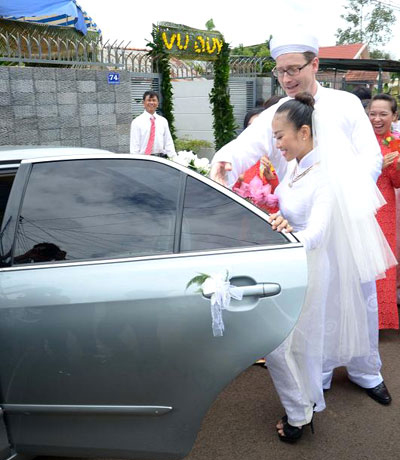 Chú rể ga lăng khi mở cửa cho cô dâu lên xe hoa về nhà chồng. |