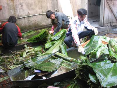 Rửa lá dong chuẩn bị gói bánh chưng |