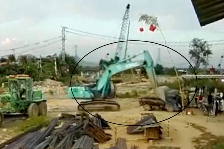 Ô tô tải bị xe máy múc đập nát trước lán trại (Ảnh cắt từ clip).