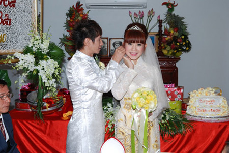 ![]() Minh Hà thay chiếc váy cưới đính 760 viên đá quý do một người bạn thân thiết kế tặng cô nhân ngày trọng đại |