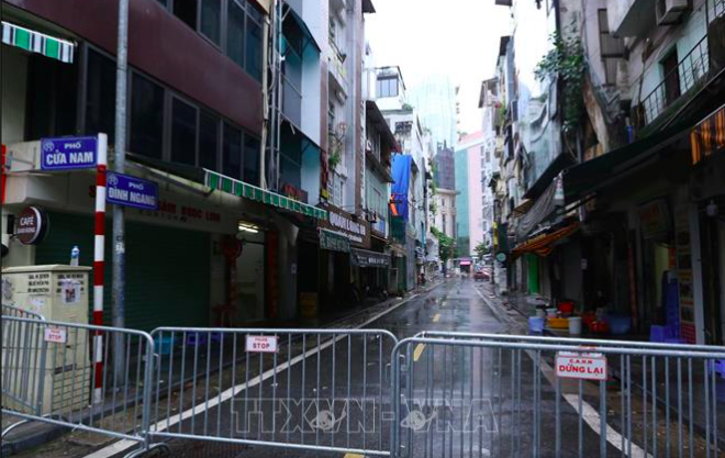 UBND phường Cửa Nam đã tạm thời phong tỏa phố Đình Ngang vì liên quan dịch tễ của người phụ nữ từ TP HCM về mắc COVID-19. Ảnh: TTXVN