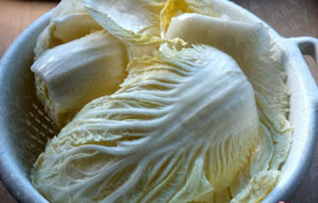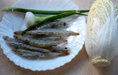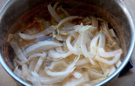 Trong khi chờ nước đun vỏ và đầu tôm sôi, bạn cắt cải thảo thành sợi vừa ăn, chú ý để cọng riêng, lá riêng. |