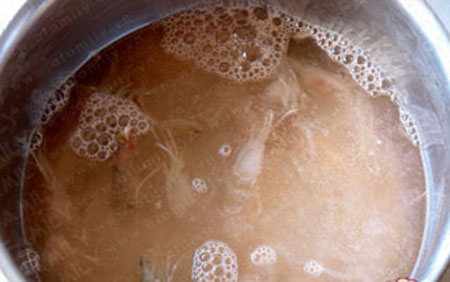 Tôm bóc vỏ và đầu để riêng. Bắc nồi nước lên bếp, cho đầu và vỏ tôm vào đun sôi lấy nước ngọt. |