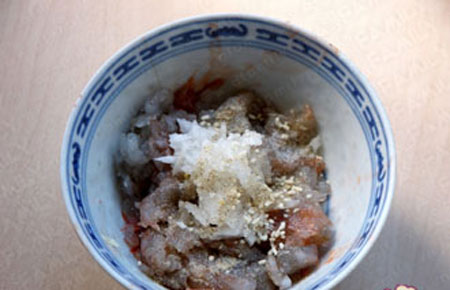 Thân tôm giã nát trộn với đầu hành băm nhỏ, 1/2 muỗng nhỏ hạt nêm và chút xíu muối, đường, tiêu. |