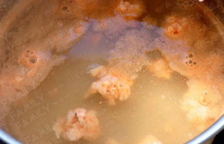 Nước sôi bạn vớt hết vỏ và đầu tôm ra sau đó dùng muỗng múc từng viên tôm cho vào, đun nước sôi trở lại. Muốn để viên tôm đẹp không nát thì khi nước sôi trở lại, tôm chín bạn vớt ra bát để riêng. Nhà mình thích ăn tôm băm hơn nên mình không vớt ra. Thêm vào nước dùng ½ muỗng nhỏ muối, ½ muỗng hạt nêm, ½ muỗng đường, nêm cho vừa miệng. |