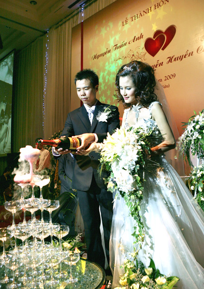 Lễ cưới của Huyền Châu và chàng doanh nhân hơn 7 tuổi đã diễn ra ấm áp tại khách sạn sang trọng thuộc hàng bậc nhất Hà Thành, trong không gian ngập tràn ánh nến và hoa trắng do chính tay cô dâu chú rể khéo léo sắp đặt. Đến chung vui với cặp trai tài gái sắc là hai bên gia đình và những người bạn thân thiết…