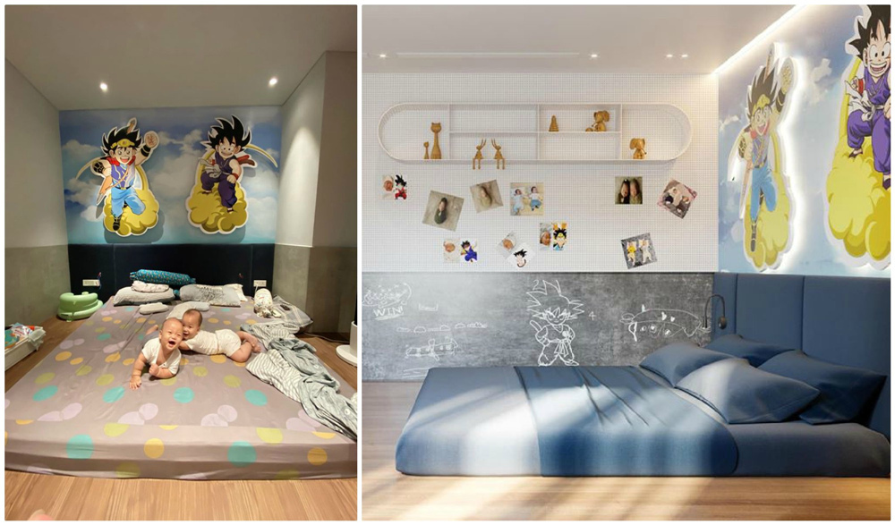 Phòng của hai bé nhà Thành Trung được trang trí với hai hình ảnh của Goku và Daino - hai nhân vật truyện tranh nổi tiếng và cũng là tên thân mật của hai bé nhà nam MC
