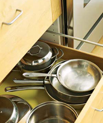 Một trong những vật dụng không thể thiếu khi nấu nướng là xoong nồi. Do đó, để tiện lợi cho việc chuẩn bị món ăn hàng ngày, bạn nên dành một khu vực gần bếp nấu cho loại vật dụng này. Bạn có thể sử dụng ngăn kéo hoặc tủ bếp, giá đựng cho loại vật dụng này.