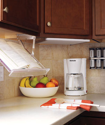Sách hướng dẫn nấu ăn là vật quen thuộc của các chị em phụ nữ, nhất là khi bạn muốn thử nghiệm món ăn mới. Một giá đựng sách gắn trên tường cho phép bạn xem công thức nấu ăn tiện lợi hơn đồng thời bảo vệ sách khỏi bị bẩn. Nhưng nhớ chọn loại giá có thể mở ra gập vào để tiết kiệm diện tích nhé.