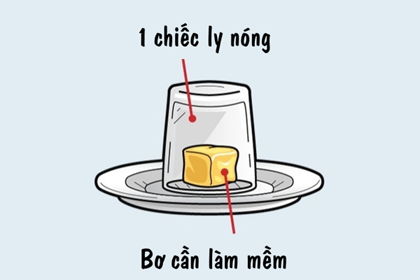 Nếu không có lò vi sóng hoặc không có đủ thời gian để miếng bơ tự chảy mềm sau khi để tủ lạnh, bạn có thể dùng một thủ thuật nhỏ, đó là làm nóng một ly nước sau đó đem úp lên miếng bơ. Chỉ sau một lúc, miếng bơ sẽ bắt đầu mềm ra dần mà không bị bay mất mùi.
