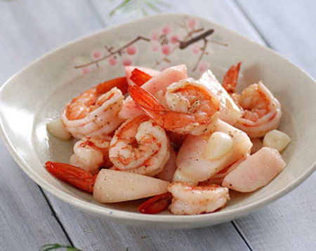 - Tiếp tục xào tôm và quả đào, nêm nếm lại gia vị, cho hạt tiêu đen và tắt bếp.