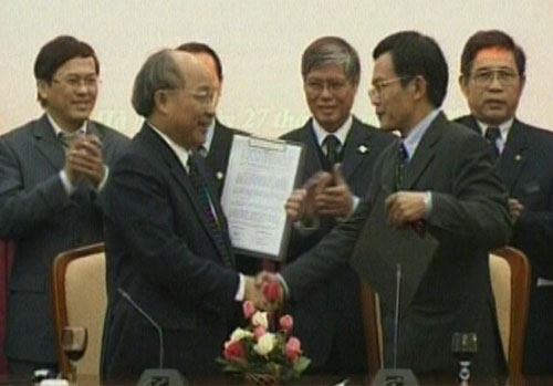 Bộ trưởng Bộ Y tế Nguyễn Quốc Triệu và Phó Tổng Giám đốc Đài Truyền hình VN Trần Đăng Tuấn ký biên bản hợp tác thành lập kênh O2TV. |