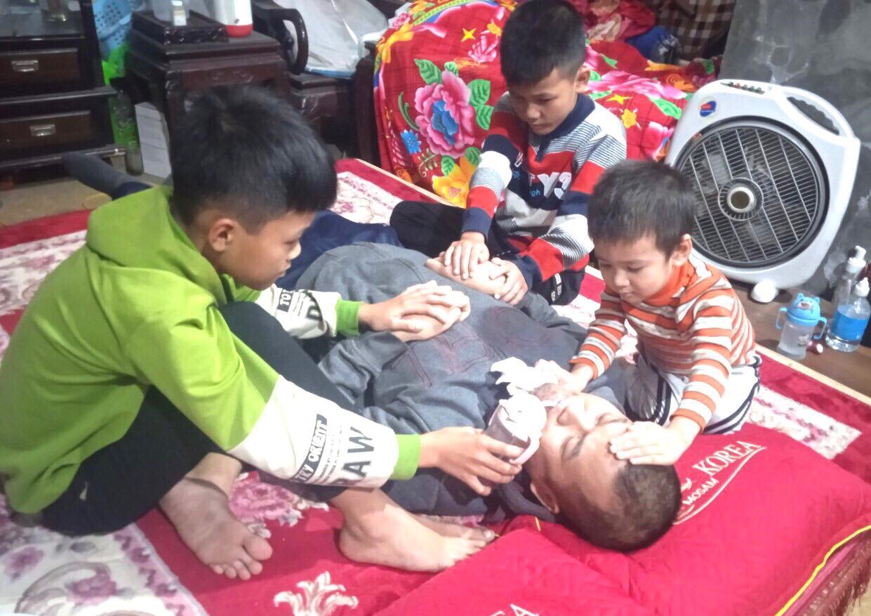 Anh Tỉnh nằm liệt giường sau tai nạn, việc học của 3 con cũng ảnh hưởng. Ảnh GDCC
