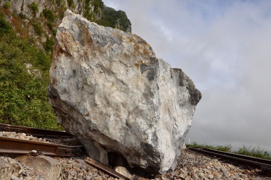 Nhiều tảng đá ước tính nặng hàng trăm tấn từ trên núi đá vôi rơi xuống đường ray ở Quảng Bình khiến tuyến đường sắt Bắc - Nam bị hư hỏng nặng.