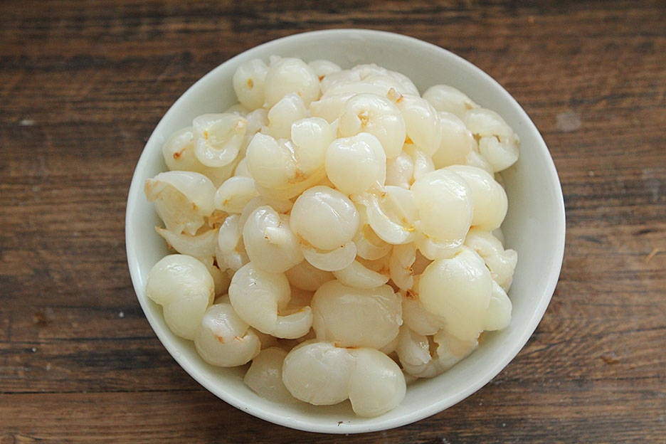 Bóc bỏ hạt vải, tách lấy phần cùi rồi để riêng ra bát.