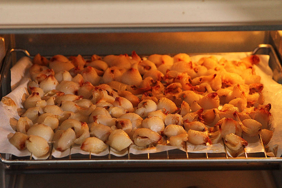 Cho tất cả cùi vải lên vỉ nướng có lót giấy nến rồi cho vào lò nướng.