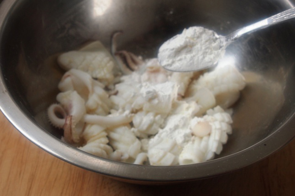 Bước 1: Mực rửa sạch, lột vỏ ngoài, xắt thành miếng. Thêm bột bắp vào trộn đều với mực.