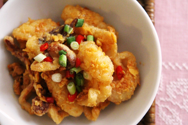 Bước 2: Làm nóng chảo chứa nhiều dầu, rán mực đến khi chuyển màu vàng nâu. Lấy ra để ráo dầu. Cho tỏi băm nhỏ và trứng muối vào chảo, xào đến khi lòng đỏ chuyển thành màu kem. Thêm mực chiên vào trộn đều.