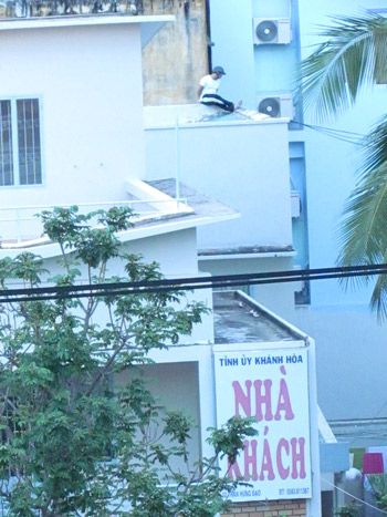 ![]() Bình trên nóc lầu 2 nhà khách tỉnh ủy Khánh Hòa và đòi nhảy xuống đất tự tử nếu có người lên. Ảnh: Việt Nữ. |
